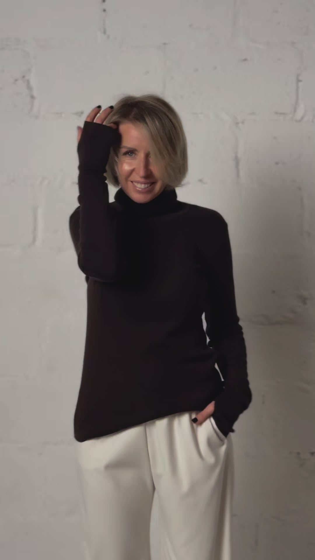 Alina Ivanova Coffee sweater is snug, looks elegant.