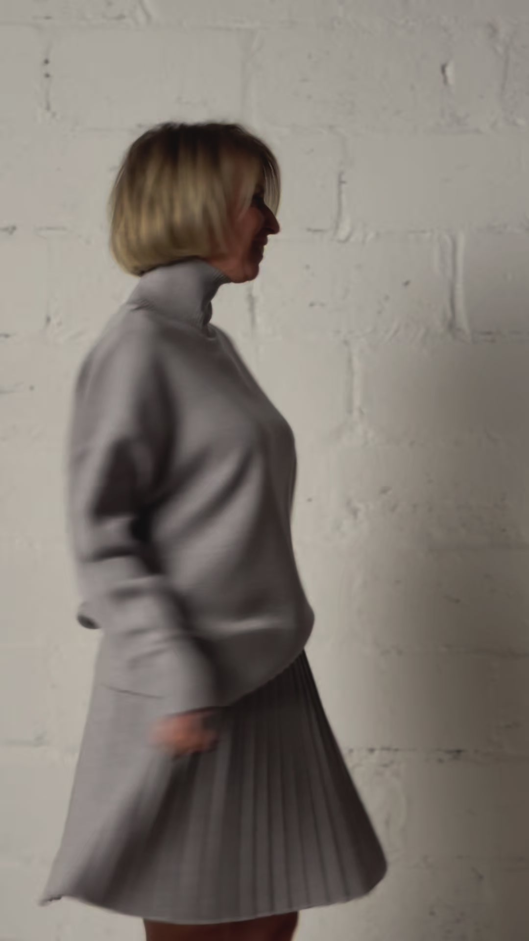 The short pleated skirt adds lightness and femininity, creating a harmonious contrast with the voluminous top.