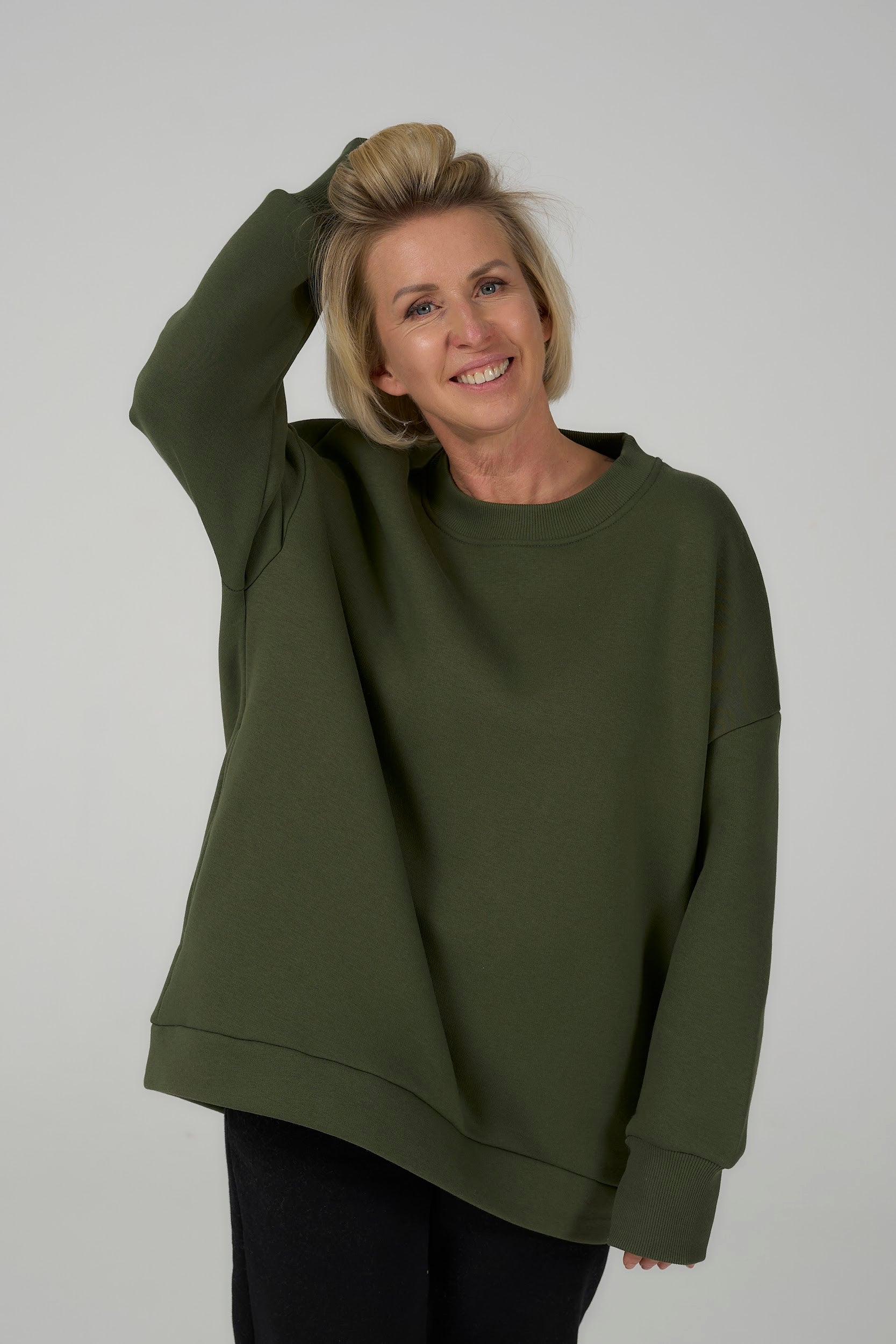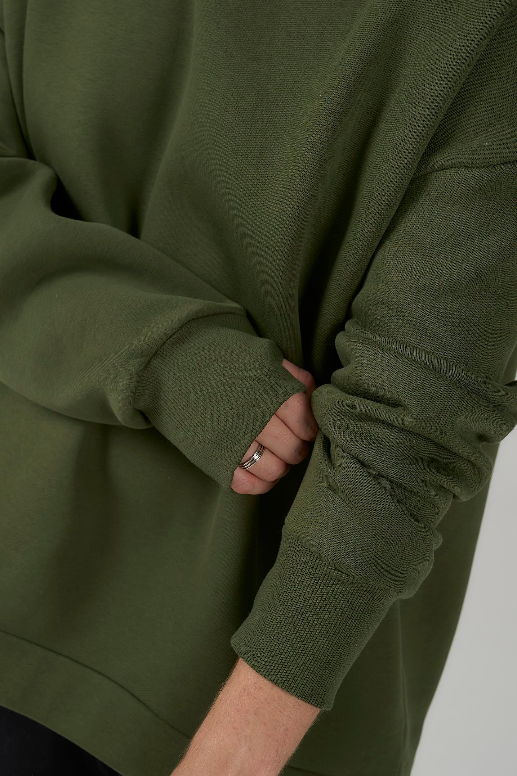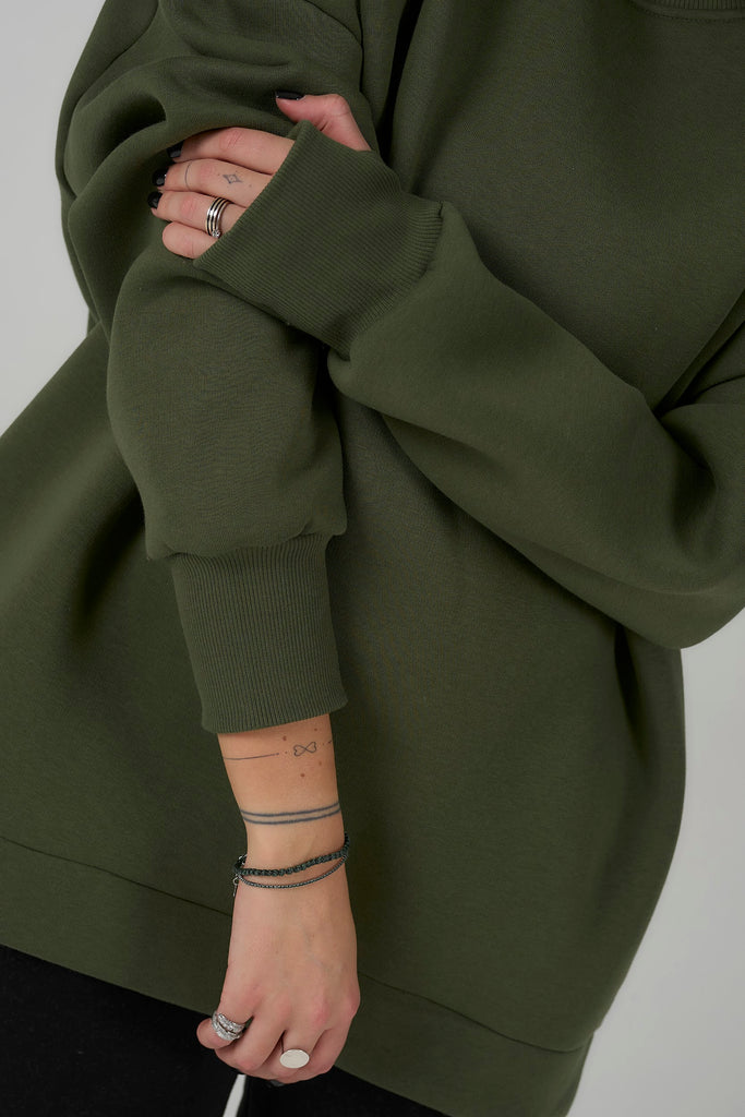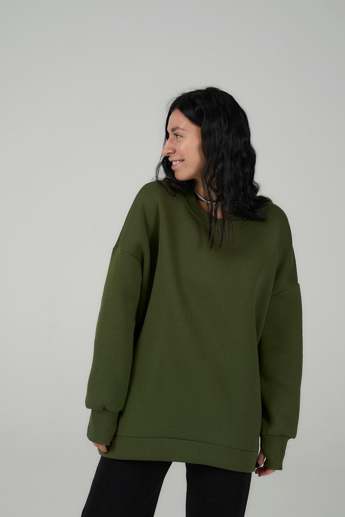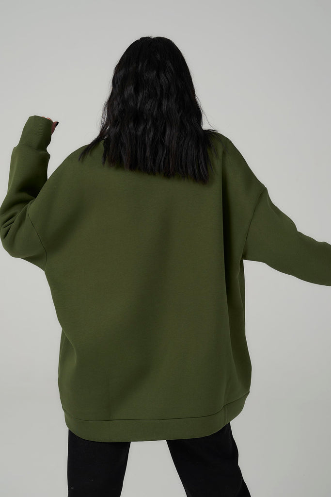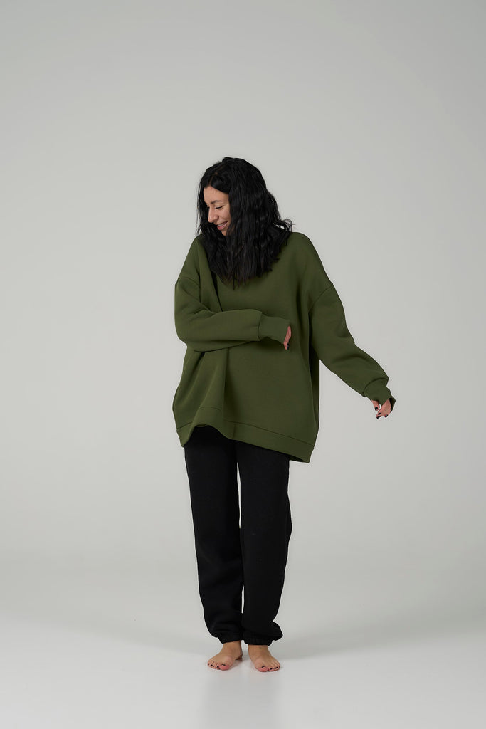 Green sweatshirt is cozy, trendy.
